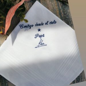 FOTO DE LA DERECHA .- pañuelo de algodón con frase (contigo desde el cielo, va incluida la estrella o corazón) y una firma , Bordado en azul azafata. PRECIO 28€